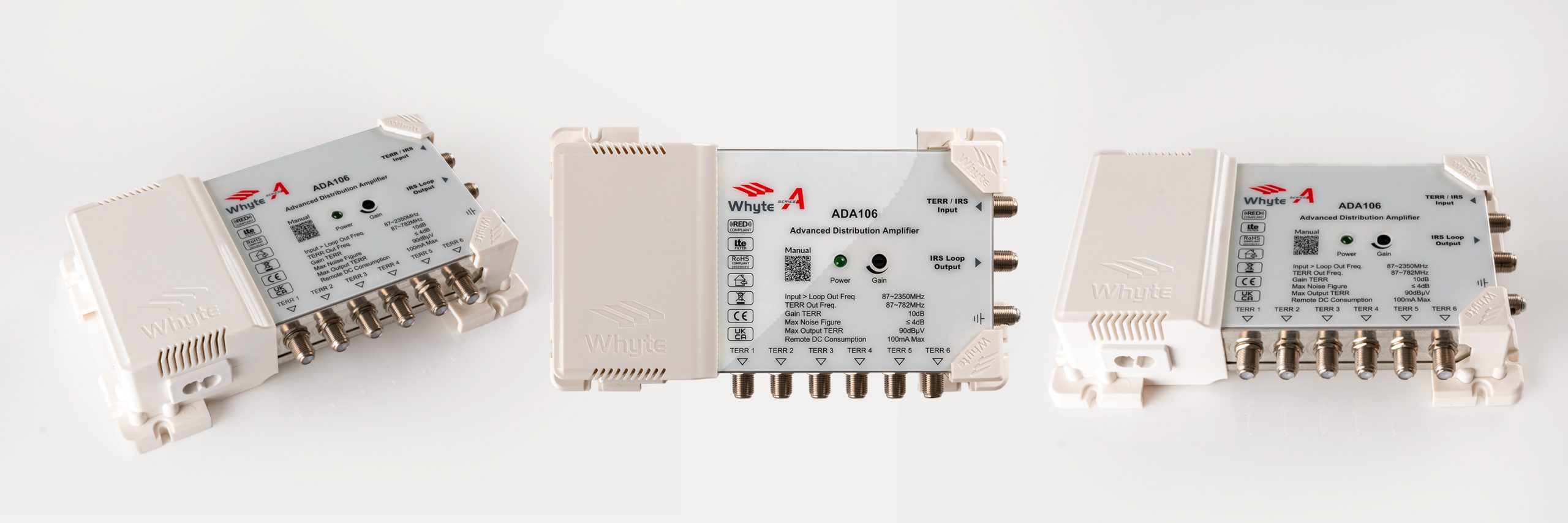 The Whyte Series A Distribution Amplifiers are available in sizes ranging from 2-Way to 16-Way. The IRS Loop-through can also be used to cascade multiple units to create large scale Master Antenna TV systems (MATV). When used as a standard TERR and RADIO Distribution Amplifier, the Whyte range of Distribution Amplifiers offer a professional, low noise, high gain solution.