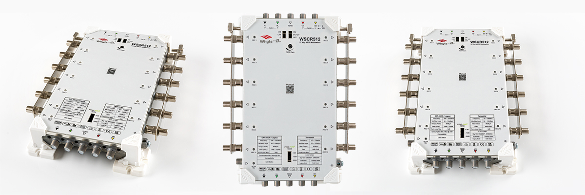 Advanced Cascadable 12 way dSCR Multiswitches enable seamless integration with conventional IRS Systems due to extremely low power consumption, low loss passive trunks and high gain Terrestrial, make the new Series D range from Whyte the most versatile and easy to install dSCR Multiswitch range available. Each subscriber output provides SkyQ, Legacy, TV and Radio. Satellite subscriber signal levels in both Legacy and dSCR mode are automatically set to 85dBμV. Terrestrial signal levels are controlled via a manual Gain Control knob and a selectable Protean Tap which permits a wide range of TERR input signal levels from 50 to 108dBμV. The reception of 2 satellites can easily be achieved by utilising 2 Wideband LNB’s and switching the unit to Wideband LNB mode. The unit can be powered directly via the DC input port or be remotely powered via the trunk lines.