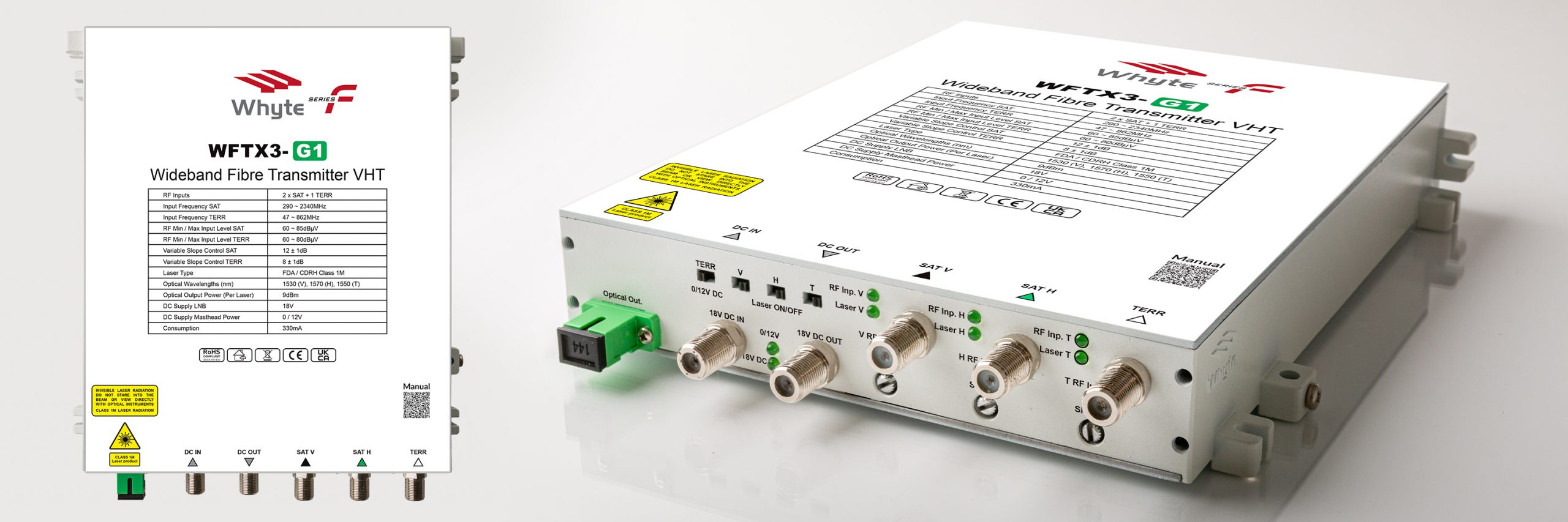 The Whyte WFTX range of Optical Fibre Transmitters offer an efficient quality solution for Fibre IRS systems. Whyte Optical Transmitters utilise a single laser per input which are multiplexed (CWDM) for a single optical output. This configuration ensures minimum signal degradation. The V and H SAT inputs are compatible with all Wideband LNB’s and will accept any signals within the 290~2340MHz range. The TERR input 47 ~ 862MHz supports FM, DAB and DTT. The WFTX3-G1 features DC in and DC Output, Laser On/Off switches for V, H & TERR, Variable Slope Control for V, H and TERR and Masthead Power switch for enabling/disabling 12V DC at the TERR RF input. The WFTX3-G1 is a three-laser CWDM device.