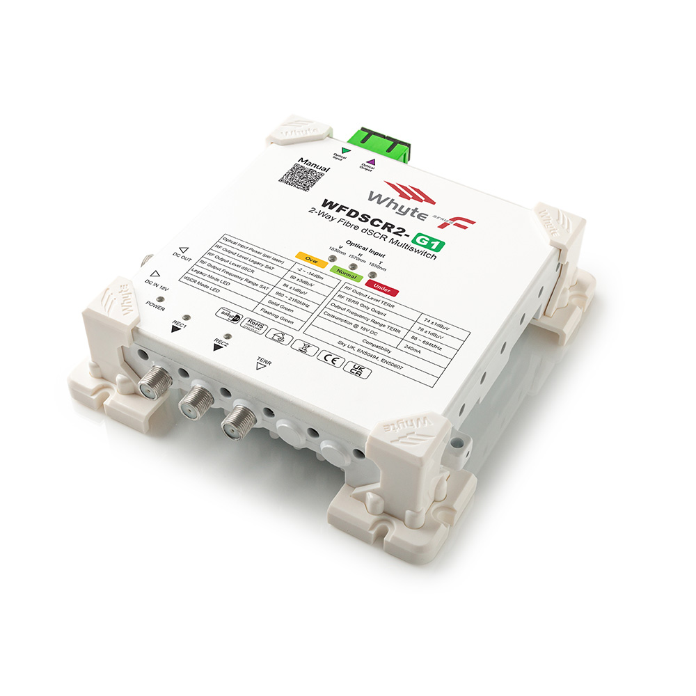 Whyte optical dSCRs feature a DC Output for powering additional devices in the apartment. Ideal for the Whyte Advanced Distribution Amplifier (ADA) providing cost effective additional Terrestrial outlets in the apartment.