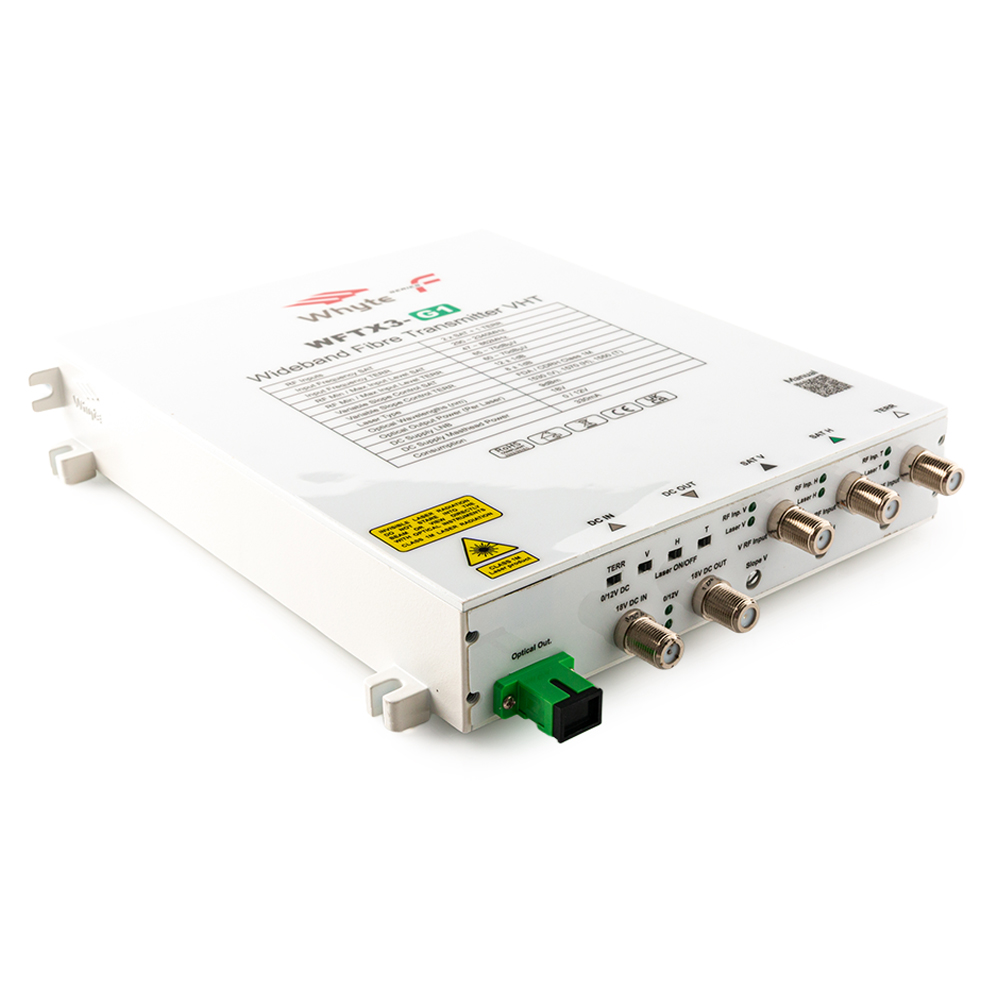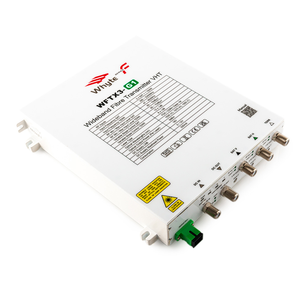 The V and H SAT inputs are compatible with all Wideband LNB’s and will accept any signals within the 290~2340MHz range. The TERR input 47 ~ 862MHz supports FM, DAB and DTT. The WFTX3-G1 features DC in and DC Output, Laser On/Off switches for V, H & TERR, Variable Slope Control for V, H and TERR and Masthead Power switch for enabling/disabling 12V DC at the TERR RF input. The WFTX3-G1 is a three-laser CWDM device.